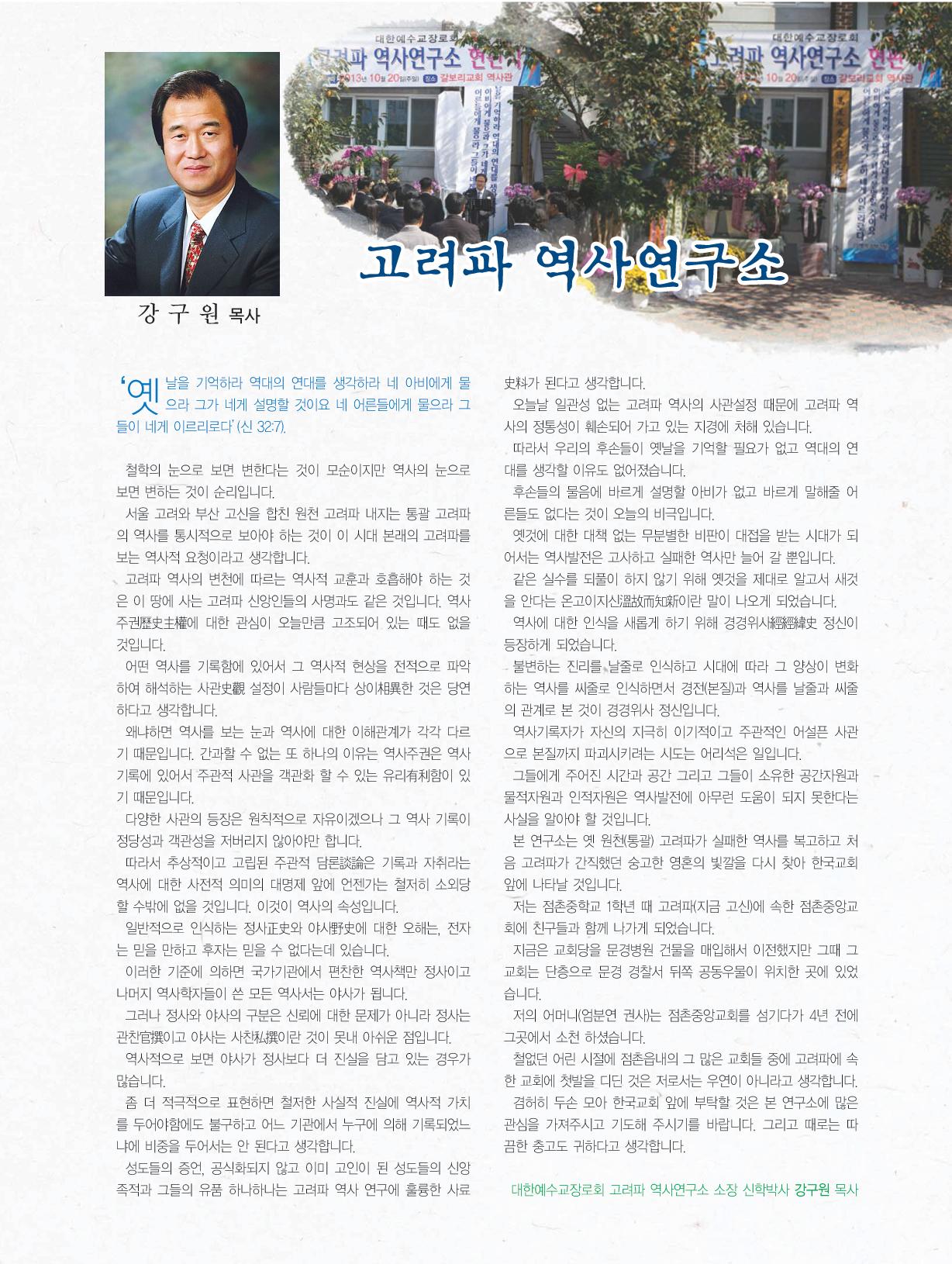 고려파 역사연구소(소장:강구원 목사)를 설립하였다. 2013년 10월 20일(주일)에는 현판식을 했으며 현판식 소식은 10월 23일(수)에
